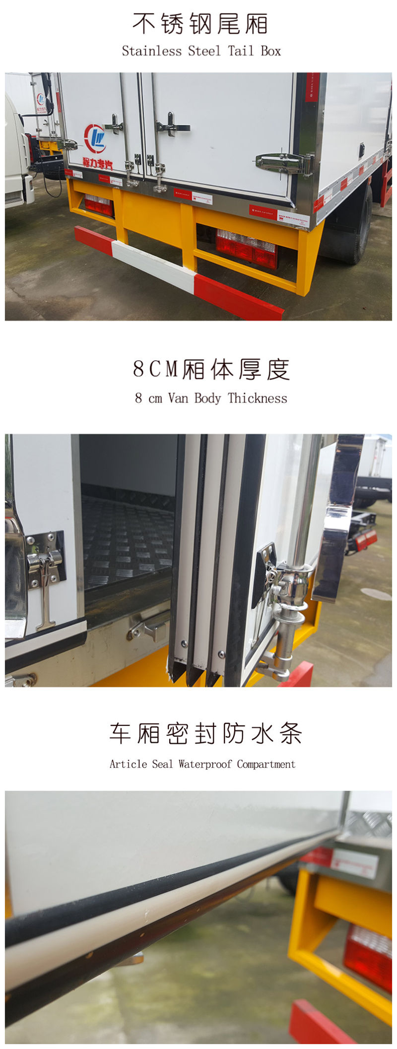 三、选装配置:可选装厢体侧门(单侧门或双开门),可选装铝合金导风槽(导风槽有助于冷气循环,提升制冷效果),可选装厢体顶部加固肉勾滑道(直滑道 或 对接互通式拐弯滑道)。可选装厢体内部采用全面不锈钢材质(海鲜运输必须加装,海水有腐蚀性),可选装280V-380V外接电源(停车熄火后可插电冷机继续制冷工作),可选装温湿度监控记录仪(带打印功能)。