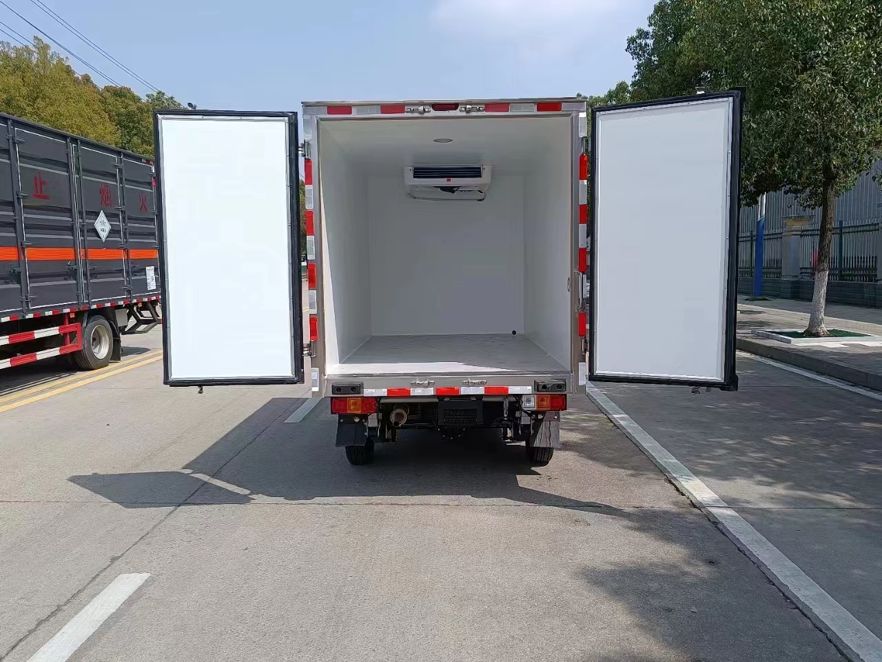 三、选装配置:可选装厢体侧门(单侧门或双开门),可选装铝合金导风槽(导风槽有助于冷气循环,提升制冷效果),可选装厢体顶部加固肉勾滑道(直滑道 或 对接互通式拐弯滑道)。可选装厢体内部采用全面不锈钢材质(海鲜运输必须加装,海水有腐蚀性),可选装280V-380V外接电源(停车熄火后可插电冷机继续制冷工作),可选装温湿度监控记录仪(带打印功能)。