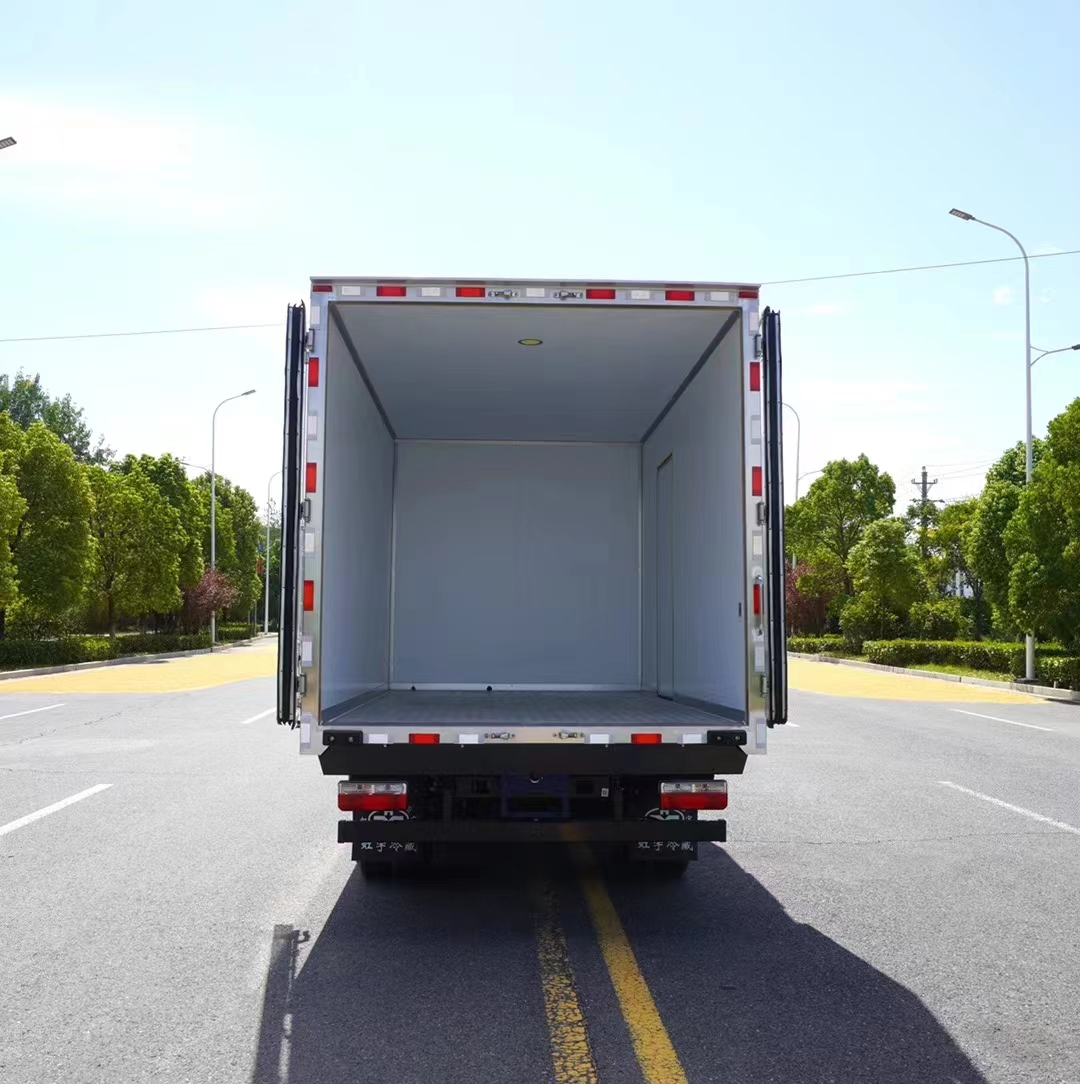 三、选装配置:可选装厢体侧门(单侧门或双开门),可选装铝合金导风槽(导风槽有助于冷气循环,提升制冷效果),可选装厢体顶部加固肉勾滑道(直滑道 或 对接互通式拐弯滑道)。可选装厢体内部采用全面不锈钢材质(海鲜运输必须加装,海水有腐蚀性),可选装280V-380V外接电源(停车熄火后可插电冷机继续制冷工作),可选装温湿度监控记录仪(带打印功能)。
