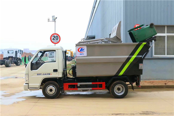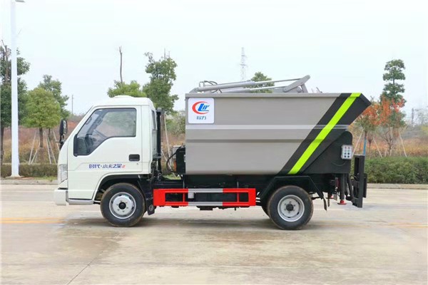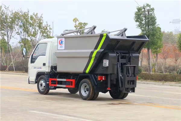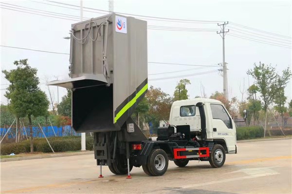 厢体尾部配置国标挂桶提升机,顶部翻转,顶部加装液压刮板压缩,压缩比为2.5:1,尾部副梁加装液压支腿装置,双顶油缸举升自卸,手电一体操作(可选遥控器)。