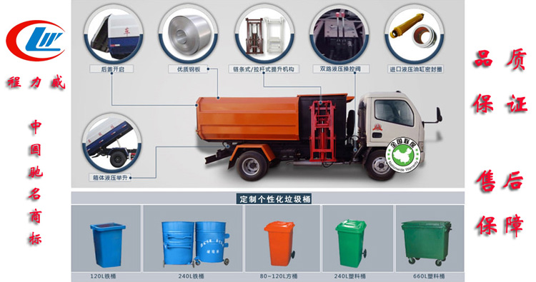 箱体采用边三底四优质钢板制作,箱体前部侧面带有挂桶提升机 构,可搭配120升或240升塑料垃圾桶,自动举升垃圾桶倒入垃圾,提 升机顶部机械翻盖,箱体底部双液压缸举升自卸,箱体后方设有挡水 槽,尾部装有橡胶密封条,防污水滴漏。