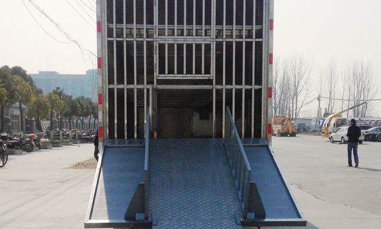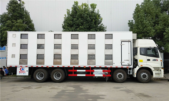 1.分层装载机构:箱体内设置4层分4栏装载机构,通过液压系统,实现隔板的升降,每层隔板配置分栏隔断。 2. 喂食系统:由液体食物箱、管道泵、管道、喂食嘴等组成,实现液态食品的输送和喂食。 3. 恒温系统:由车载制冷机,暖风机,气体混合输送仓,排风扇等组成,实现仔猪生存空间气体的流通和恒温.为保证运输过程中对温度的控制,畜禽运输车采用双系统制冷空调,且箱体两侧设计三排带电动排气扇的通风口和百叶窗,夏季通过空调实现箱内降温.为解决冬季畜禽运输采暖,采用独立的水暖系统,采用智能巡检仪,保证车厢内恒温28-32℃,在驾驶室就能实时监测箱内的温度变化,便于控制温度。 4. 喷淋系统:由气压水箱、管道、喷头、污水收集箱组成、给仔猪喷淋降温、箱体内清洁。 5. 进出通道:后门通过液压系统自动展开形成仔猪进出箱体的通道,设有护栏,方便仔猪上下。 6. 供电系统:配备微型发电机,给相关设备供电. 整车出具:底盘合格证、整车合格证、全国统一机动车发票、随车工具、车辆质保手册、全国服务站点目录。 购车必看:因车辆配置与客户需求不同,价格也不相同,实际价格请直接咨询厂家热线:13277226111曾经理!